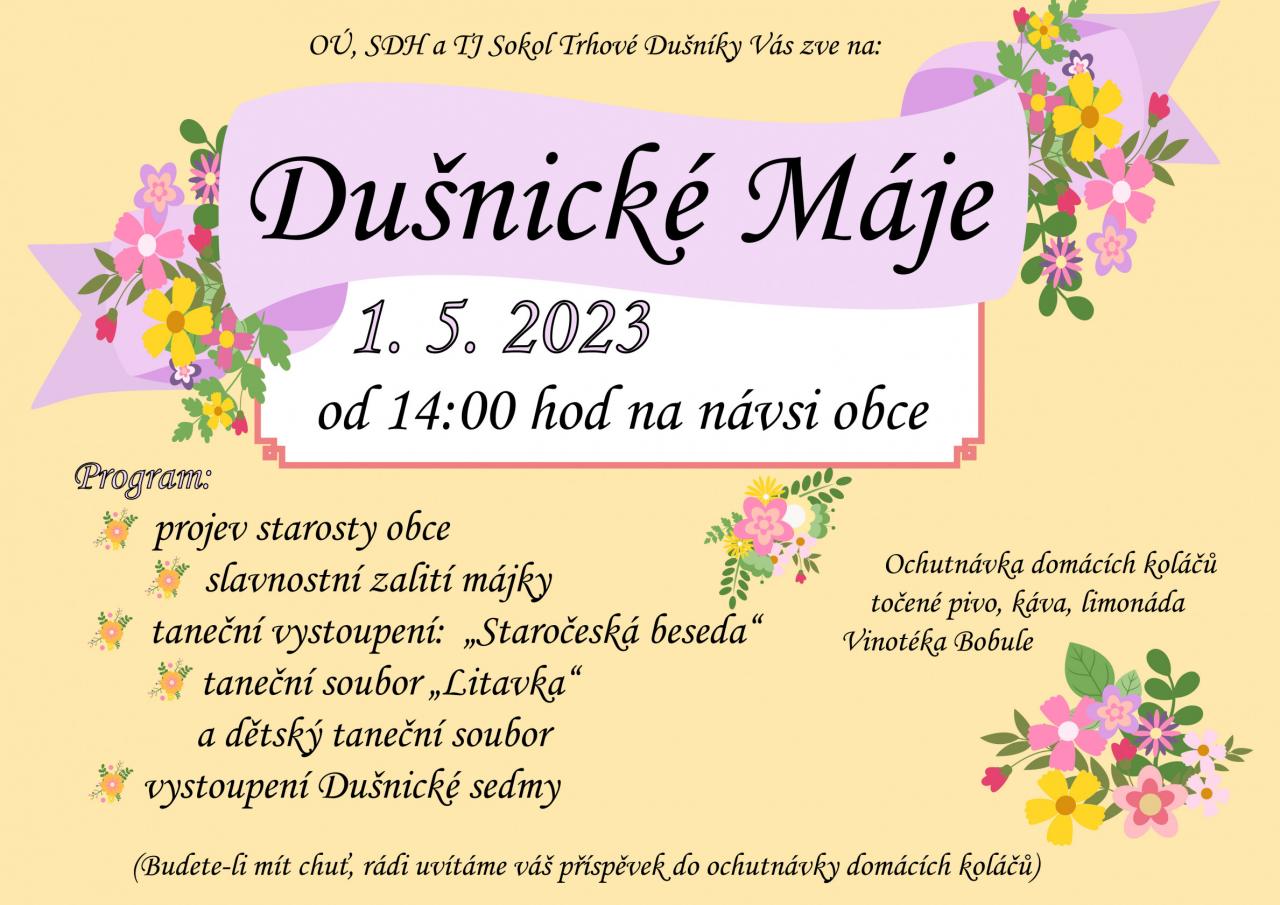 Dušnické máje 1.5.2023 na návsi obce. Těšit se můžete na skvělá taneční a pěvecká vystoupení a sousedské posezení u domácích koláčů.